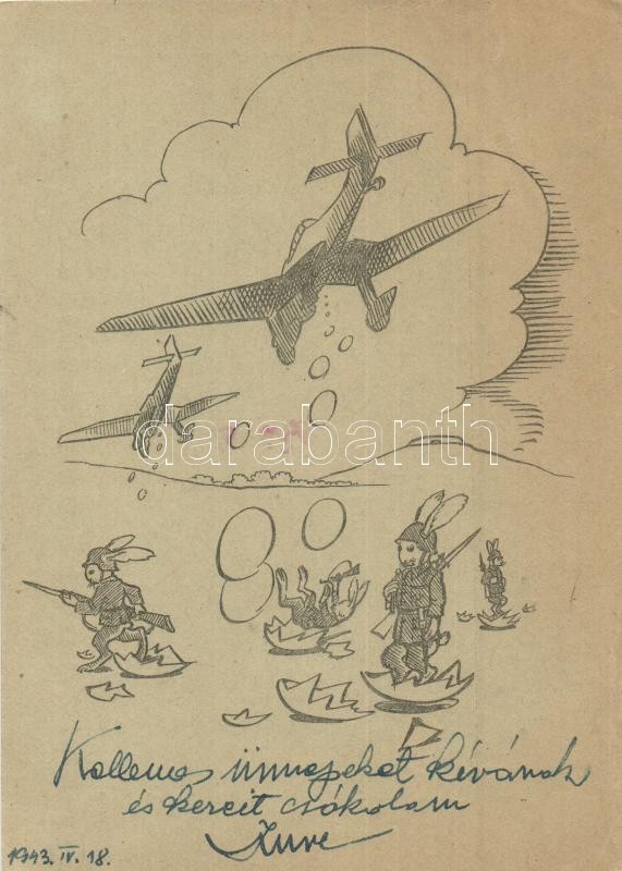 1943 Kellemes Ünnepeket! Tábori postai levelezőlap / WWII Hungarian military field post, Easter greetings with aircrafts and rabbits (EK)