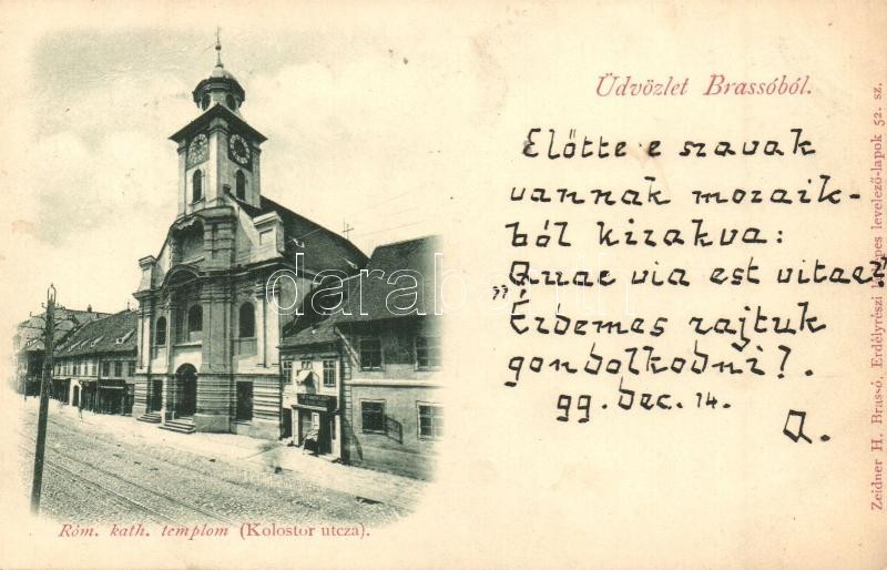1899 Brassó, Kronstadt, Brasov; Római katolikus templom, Kolostor utca, üzlet. Zeidner H. kiadása / church, street view, shop