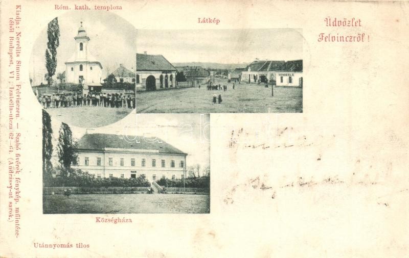 Felvinc, Vintu de Sus, Unirea; Római katolikus templom, Községháza, Vendéglő, étterem, Nevelits Simon üzlete és saját kiadása. Szabó Fivérek fényképészeti műterméből / church, town hall, restaurant, shops (EK)
