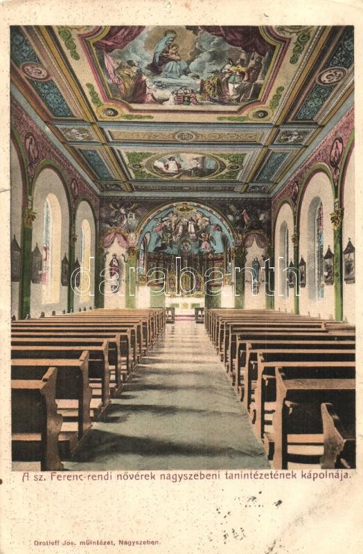Nagyszeben, Hermannstadt, Sibiu; Szent Ferenc rendi nővérek nagyszebeni tanintézetének kápolnája, belső. Drotleff Jos. műintézet kiadása / Franciscan chapel interior (kis szakadás / small tear)
