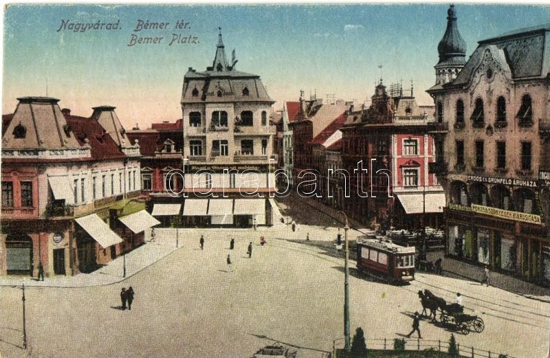 Nagyvárad, Oradea; Bémer tér, Erdős és Grünfeld, Markovits és Weinberger üzlete, villamos / square, shops, tram