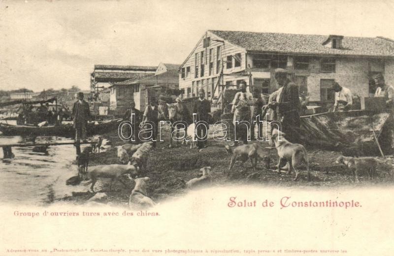 Constantinople, Istanbul; Groupe d'ouvriers turcs avec des chiens...