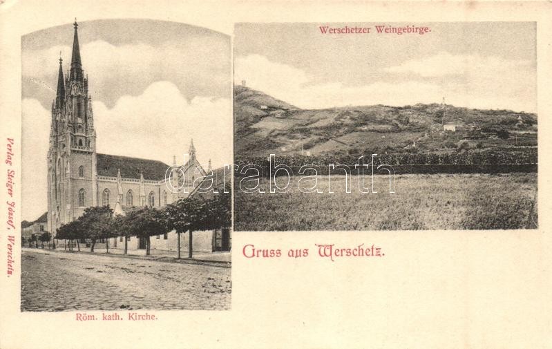 Versec, Vrsac; Római katolikus templom, Szőlőtelep. Steiger József kiadása / Röm. kath. Kirche, Werschetzer Weingebirge / church, vineyards (EK)