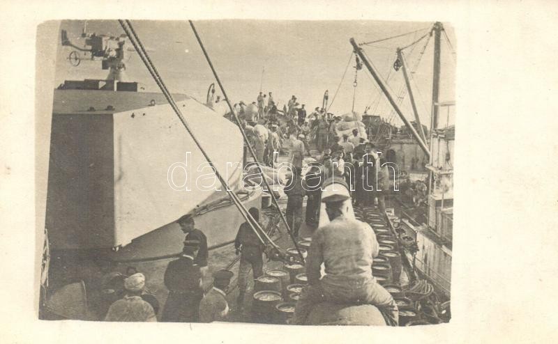 Ellátmány beszállítása a fedélzetre egy osztrák-magyar hadihajón, matrózok / K.u.K. Kriegsmarine, supply loading mariners on a battleship. photo