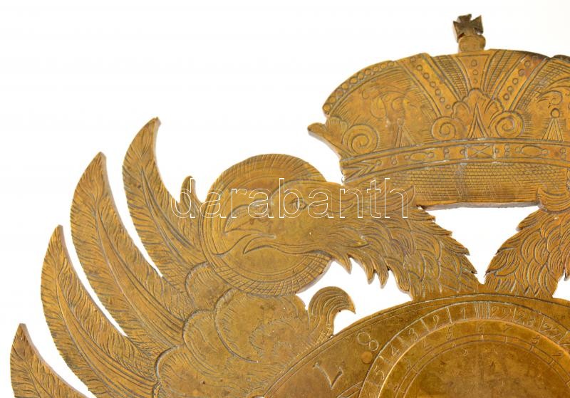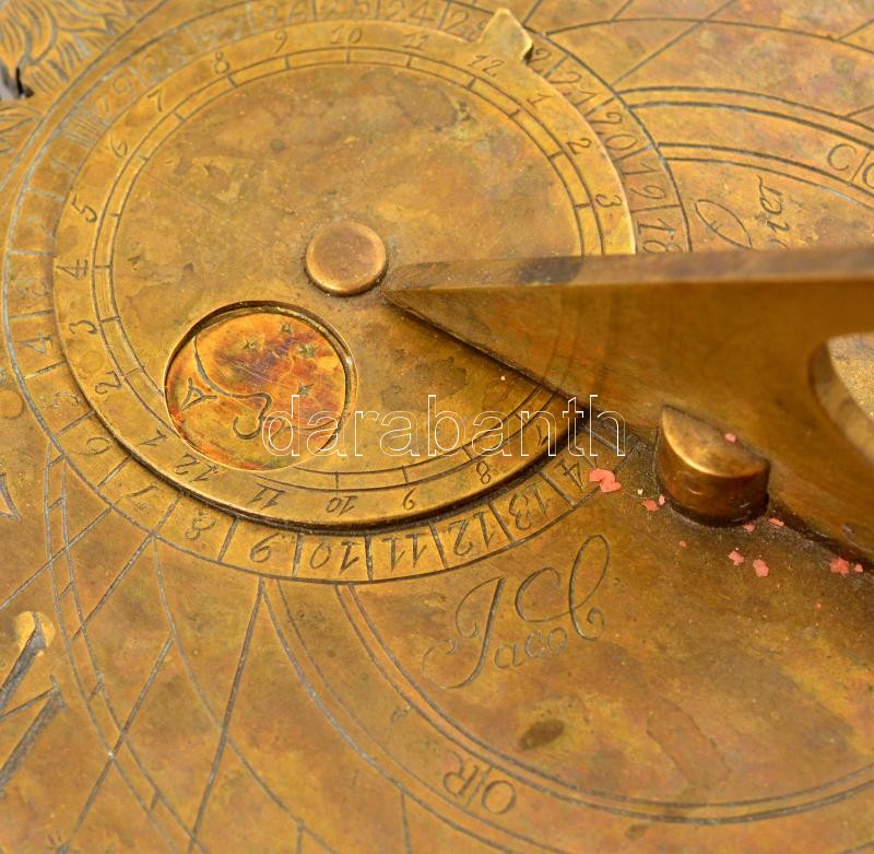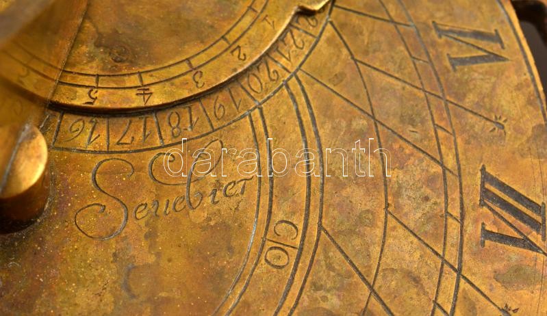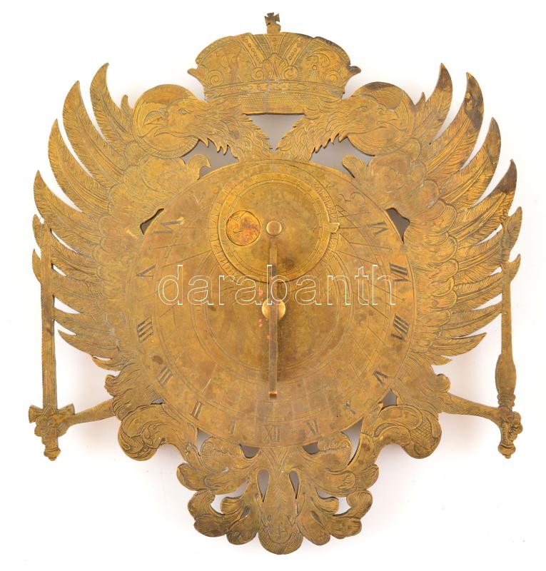 cca 1800 Jacob Senebier (itt: Seuebier(!), ?-?): Az osztrák császári címerállatot formázó, díszesen gravírozott régi bronz napóra, rögzített gnómonnal, a holdfázisok jelzésére szolgáló koronggal, 18,5×16,5×7 cm / cca 1800 Antique sundial in the form of the double-headed eagle of the Austrian Empire, richly engraved brass with fixed gnomon and an annexed rotating disc indicating the moon phases, made by Jacob Senebier (here: Seuebier(!), ?-?), 18,5×16,5×7 cm