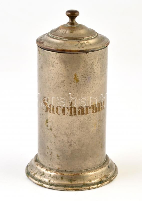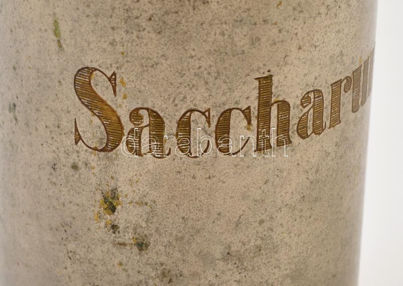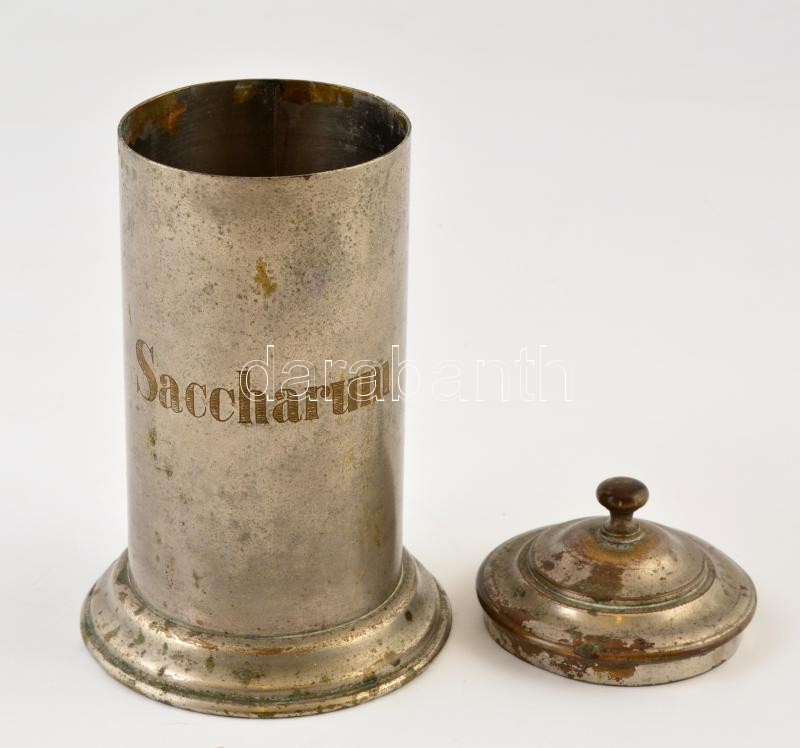 cca 1900 Saccharum - gyógyszertári fém cukortartó, kopott, m: 19,5 cm ...