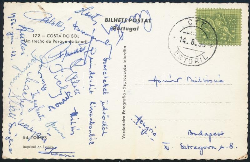 1956 Az Aranycsapat tagjainak (Kocsis, Buzánszky, stb.) aláírásai Portugáliából küldött levelezőlapon