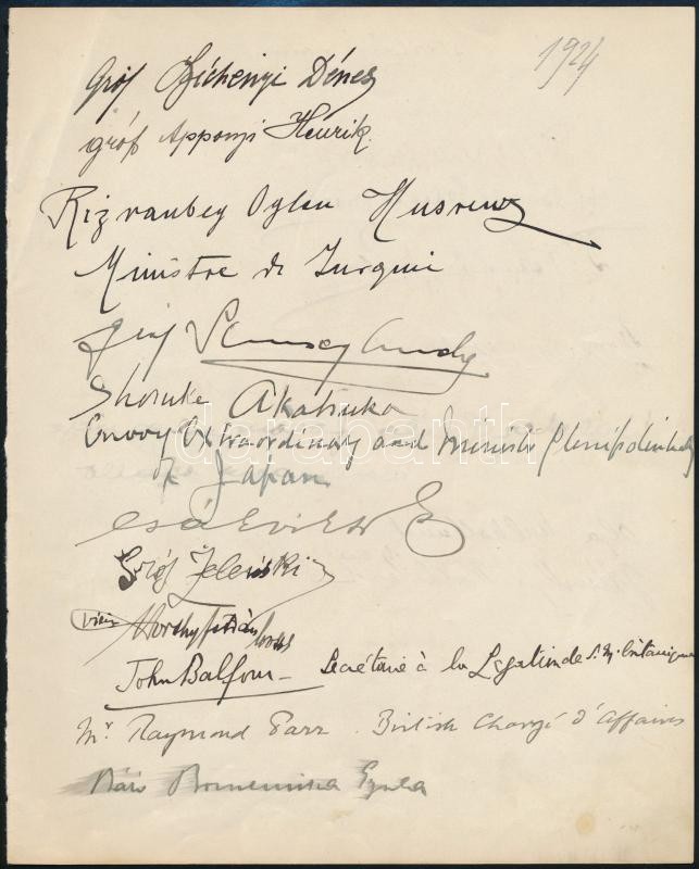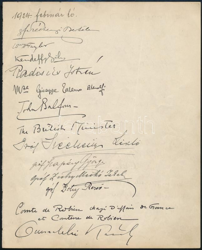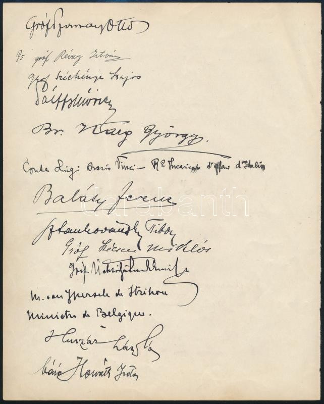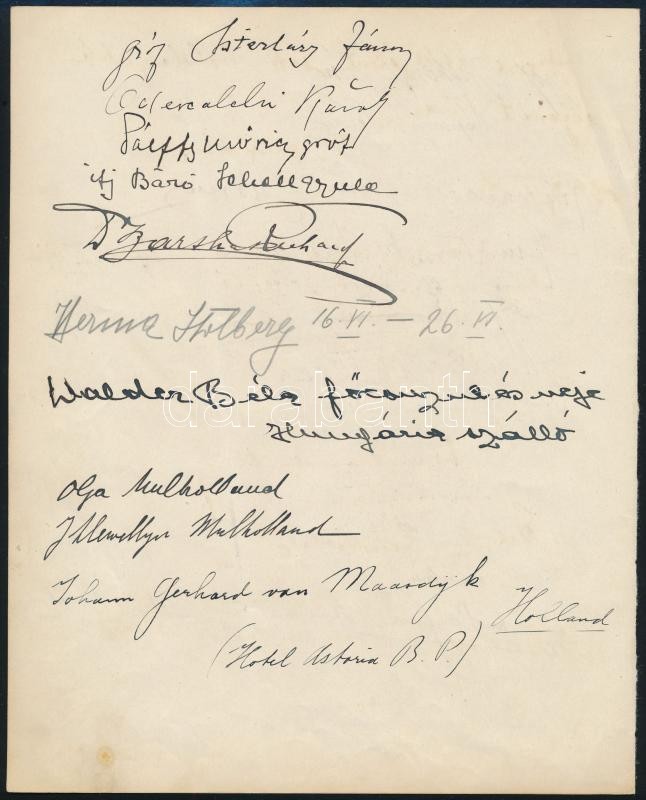 Description: cca 1924-1930 Aláírásgyűjtemény 6 oldalon. Rajta a kor leghíresebb emberei: miniszterek, politikusok, főnemesek: vitéz Horthy István, gr. Apponyi Dénes, gr. Esterházy János, gr. Zichy Rezső, külföldi miniszterek, gr. Széchenyi Dénes és sokan mások. Összesen 71 db aláírás.