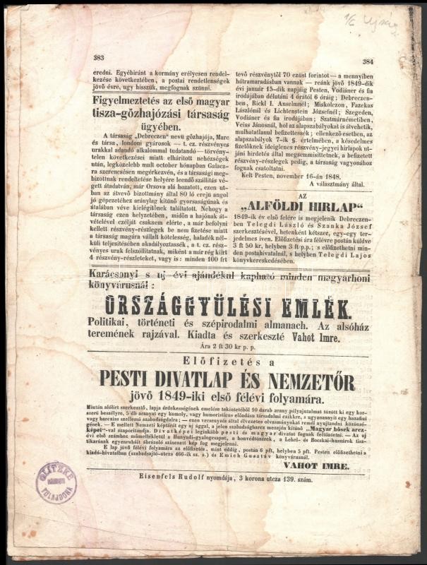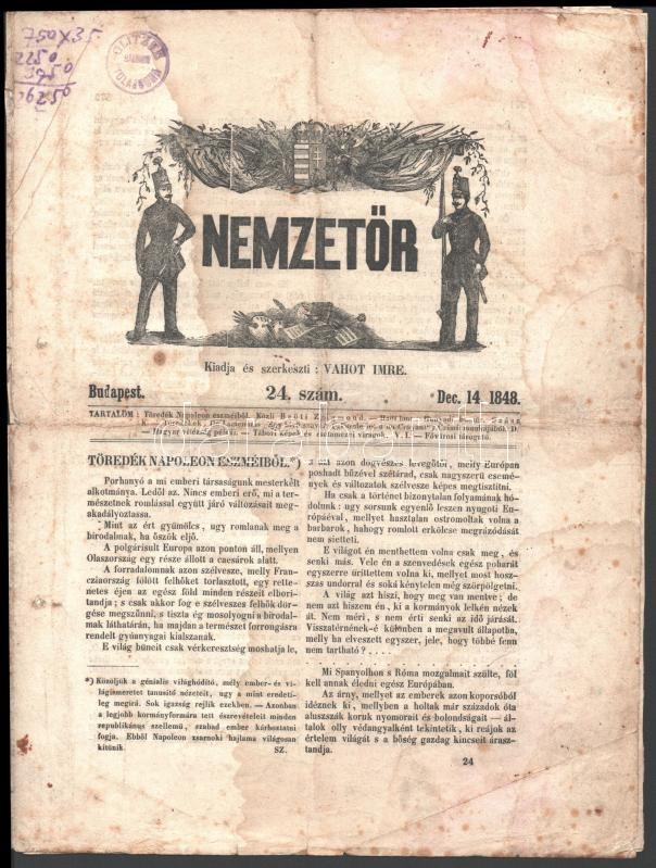 1848 Nemzetőr. Kiadja és szerkeszti: Vahot Imre. 1848. dec. 14. 24. sz. Foltos, a címlapon bejegyzéssel, két helyen tulajdonosi bélyegzővel, (kéthasábos számozás, 4 szt. lev.), 369-383 p.