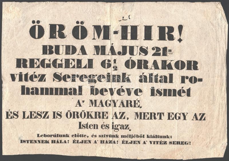 1849 május 21. Buda bevételét hirdető hirdetmény. Öröm-Hir! Buda május 21-n reggeli 6 1/2 órakor vitéz seregeink által rohammal bevéve ismét a' magyaré és lesz is örökre az mert egy az Isten és igaz. Leborulunk előtte, és szívűn méljéből kiáltunk: Istennek hála! Éljen a' Haza! Éljen a vitéz sereg! 33x23,2 cm Rendkívüli ritkaság!