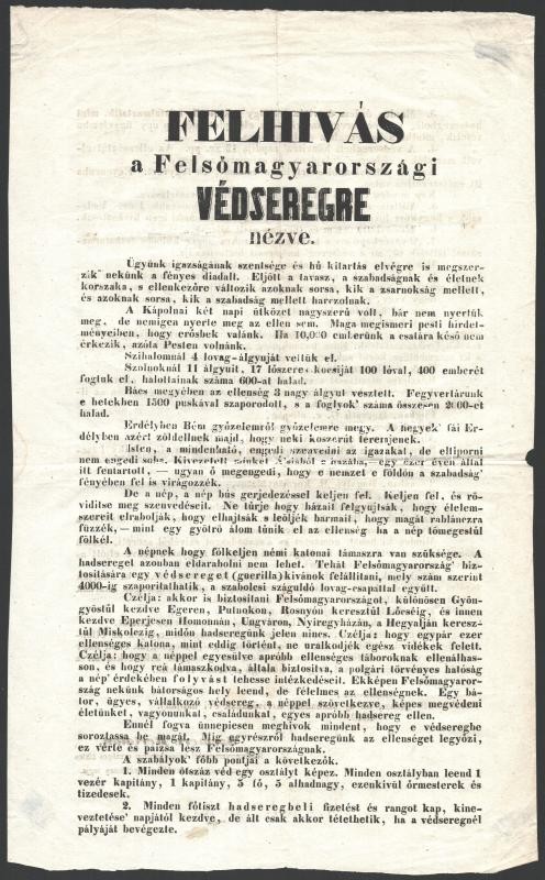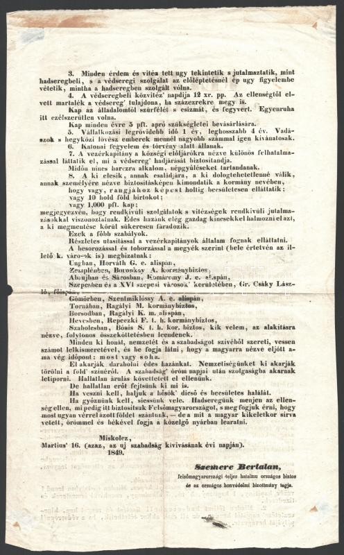 1849. március 16. Szemere Bertalan Felhívás a Felsőmagyarországi Védseregre nézve. A felhívásban Szemere egy, a Felvidéket védő gerilla hadsereg felállításáról rendelkezik a belépés feltételeivel. A Miskolcon keltezett nyomtatvány március 16. keltezését "az új szabadság kivívásának évi napja"-ként jelöli meg, a ma ünnepelt március 15-höz képest. Nagyon ritka 1848-as nyomtatvány. 38x23 cm