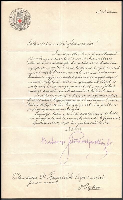 1899 Babarczi Schwarzer Ottó báró Vöröskereszt-főgondnok köszönőlevele Rapcsák Lajos kórházi intéző, főorvos részére, fejléces papíron