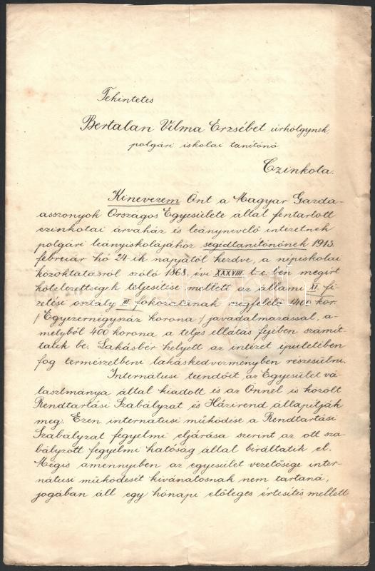 1913 a Magyar Gazdaasszonyok Országos Egyesülete kézzel írt segédtanít... https://www.darabanth.com/en/32-Major-auction/32.1/Art-and-other-collectibles/Documents~13392/1913-a-Magyar-Gazdaasszonyok-Orszagos-Egyesulete-kezzel-irt-segedtanitoi-kinevezo-oklevele-~II2030063