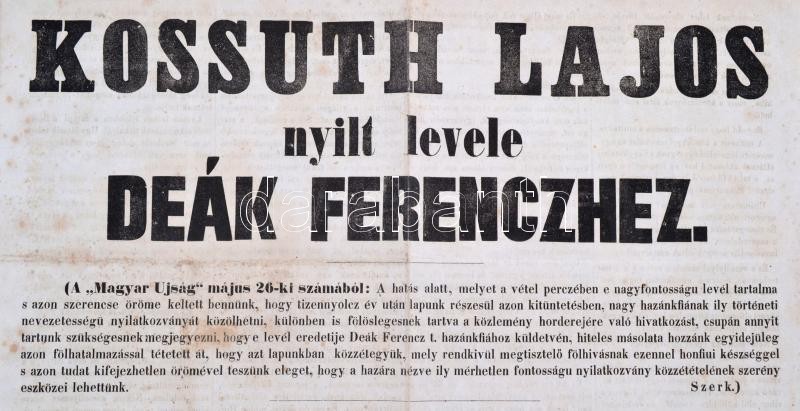 Description: 1867 Kossuth Lajos nyílt levele Deák Ferenchez A "Kasszandra levél" melyben figyelmezteti a kiegyezés elhibázottságára. Hirdetmény, önálló lap formában 36x52 cm