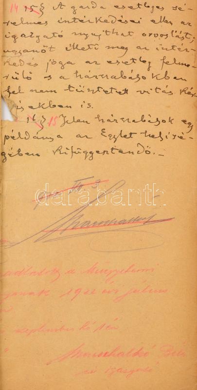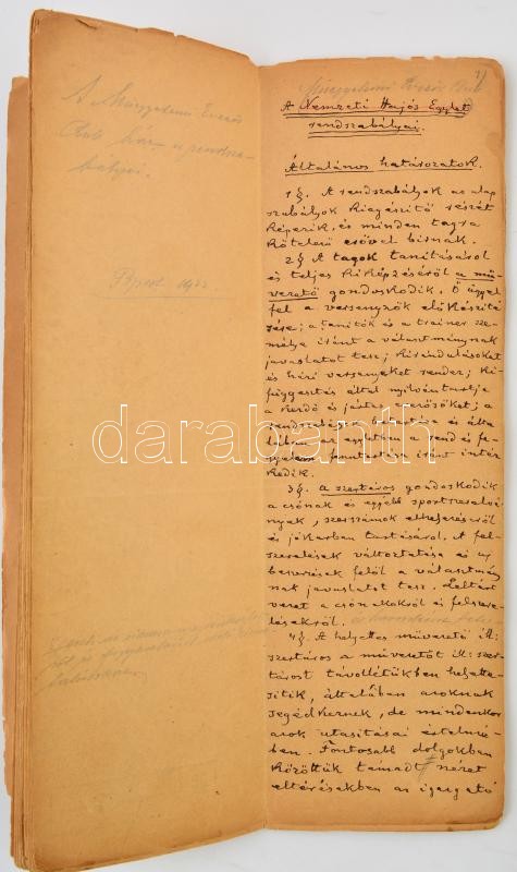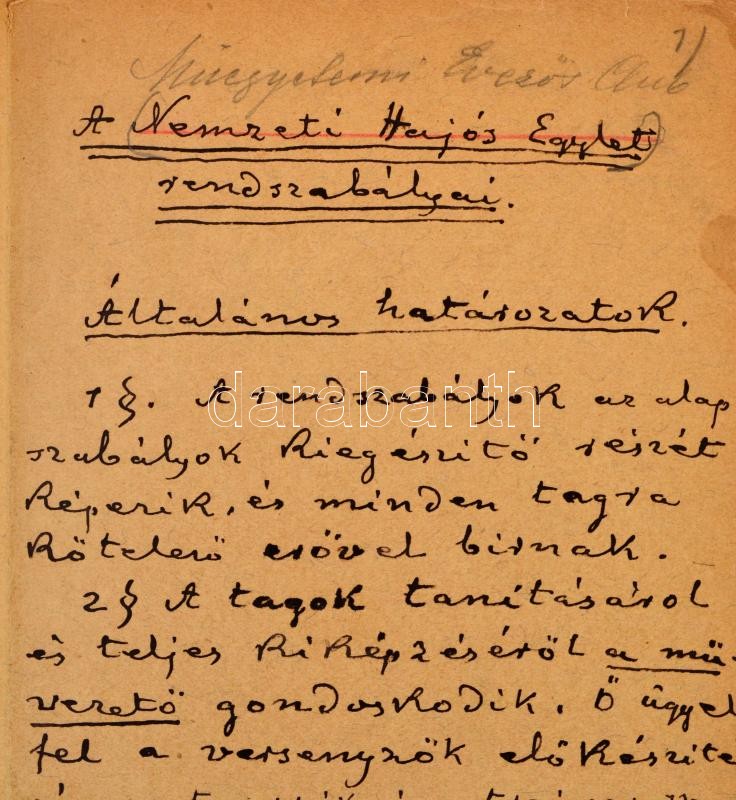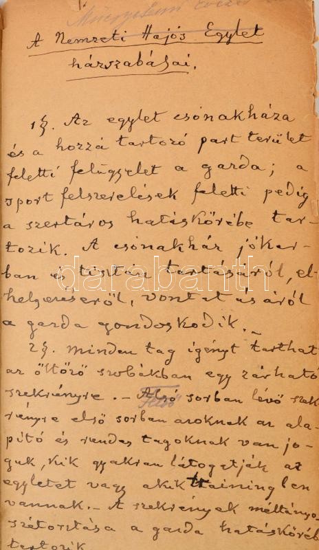 1922 Műegyetemi Evező Club ház és rendszabályai, a Nemzeti Hajós Egylet rendszabályaiból átjavítva, módosítva, hajtásnyomokkal, bejegyzésekkel, javításokkal, az utolsó lap szakadt. 17 sztl. lev.