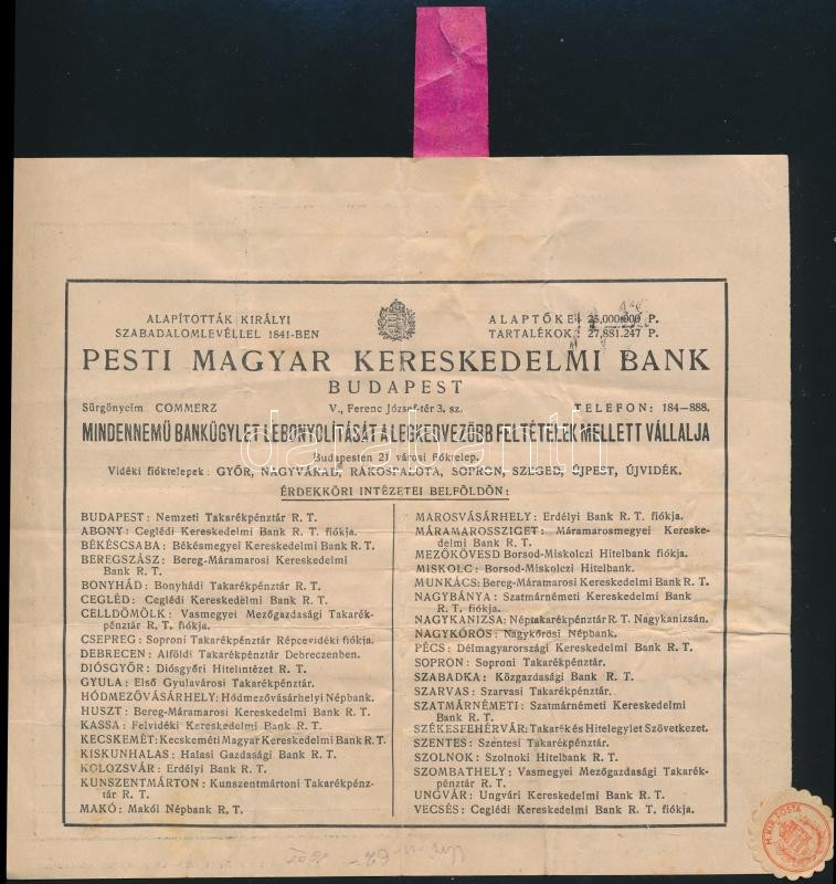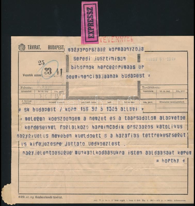 1942 Horthy Miklós (1868-1957) kormányzó távirata Serédi Jusztinián bíborosnak, melyben megköszöni a 30. országos katolikus nagygyűlés nevében küldött üdvözletet