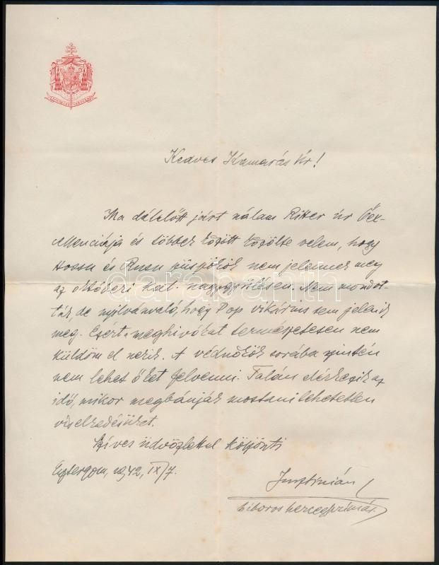 1942 Serédi Jusztinián (1884-1945) bíboros saját kézzel írt és aláírt ... https://www.darabanth.com/en/32-Major-auction/32.1/Art-and-other-collectibles/Historical-documents-manuscripts~13451/1942-Seredi-Jusztinian-1884-1945-biboros-sajat-kezzel-irt-es-alairt-egy-oldalas-levele-Es~II2036385