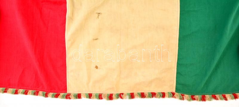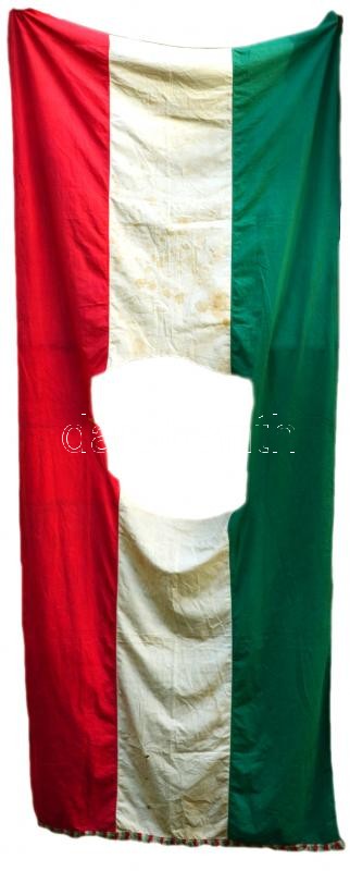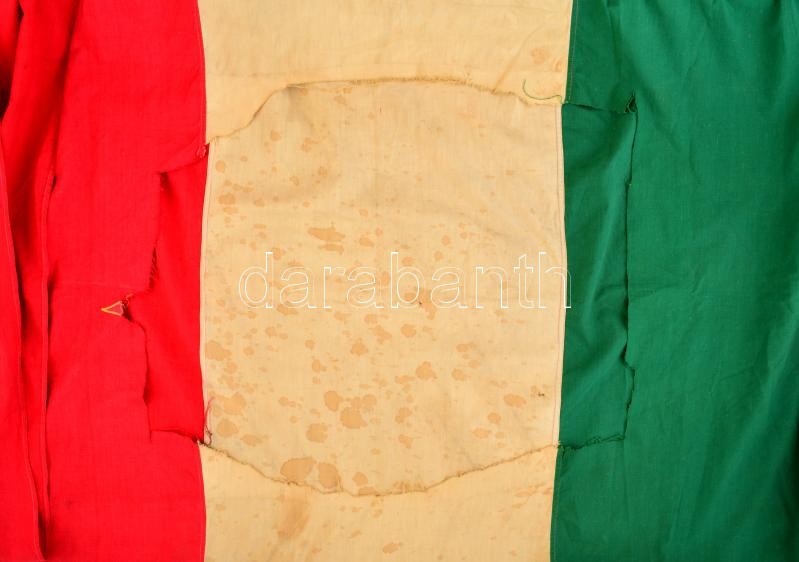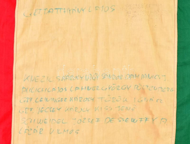 Description: 1956 Magyar nemzeti zászló, belőle kivágva a Rákosi címer. A vörös csillag vége még látszik. A lobogóra tollal felírták az aradi vértanúk neveit, valamint az 1848-as kormány tagjainak nevét. / Hungarian flag from the 1956 revolution. 300x122 cm