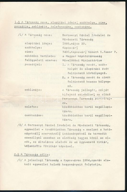 1985 Az újjáalapított Berzsenyi Dániel Irodalmi és művészeti Társaság alapszabály tervezete. 250 pld. 12p + Javaslat a társaság elnökségére. Egy gépelt oldal.