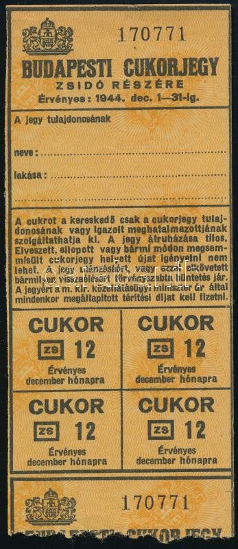 1944 Budapesti cukorjegy zsidó részére