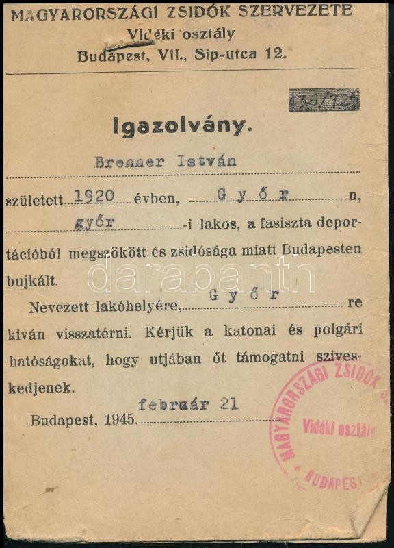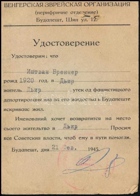 https://www.darabanth.com/en/32-Major-auction/32.1/Art-and-other-collectibles/Judaica~13835/1945-a-Magyarorszagi-Zsidok-Szervezete-videki-osztalyanak-igazolvanya-deportaciobol-megszo~II2036042