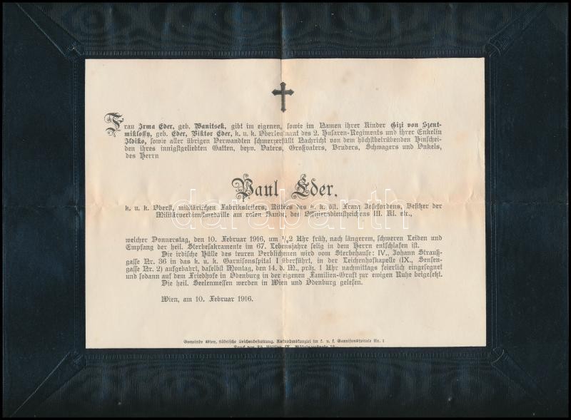 1916 Éder Pál (1849-1916) cs. és kir. ny. főhadnagy német nyelvű halál... https://www.darabanth.com/en/32-Major-auction/32.1/Art-and-other-collectibles/Military~13366/1916-Eder-Pal-1849-1916-cs-es-kir-ny-fohadnagy-nemet-nyelvu-halalozasi-ertesitoje-C3~II2035148