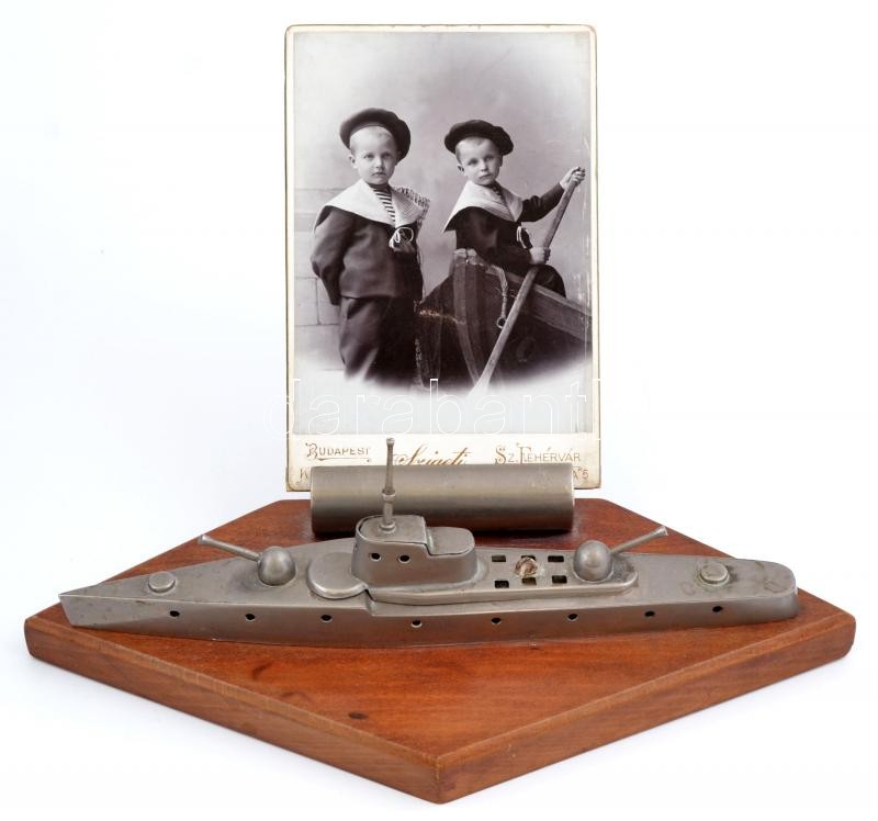 1930 Art deco stílusú hadihajós asztali dísz fényképtartó fényképpel, jó állapotban, 29×13 cm
