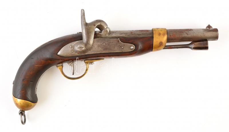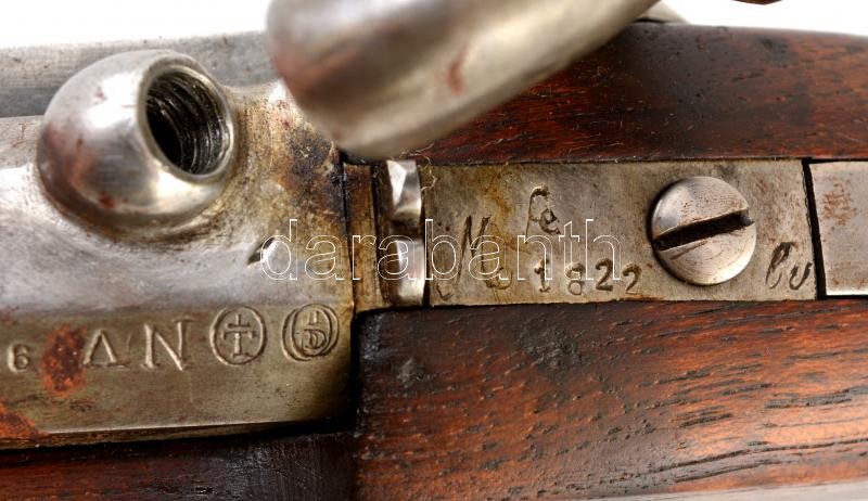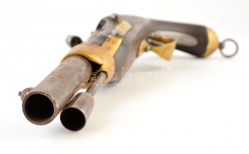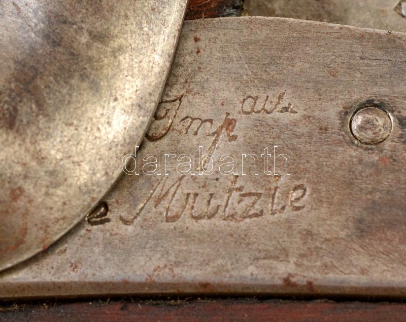 Régi francia pisztoly, fa-fém, jelzett ("Imp. au de Mutzie"), mesterjeggyel, rozsdafoltokkal, h: 34 cm / Antique French pistol, wooden and metal, with hallmark ("Imp. au de Mutzie"), with rust stains, l: 34 cm
