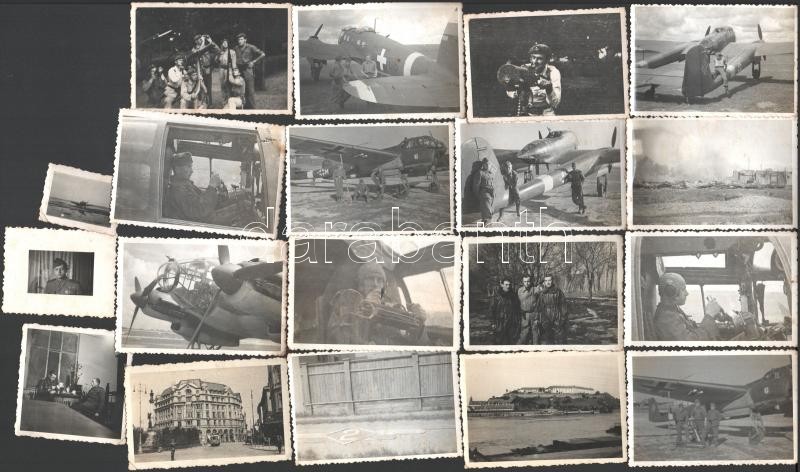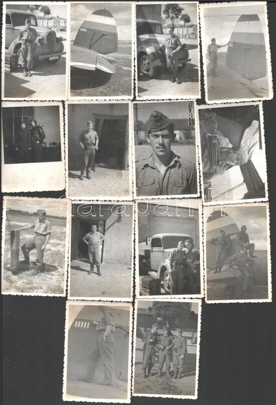 Description: cca 1942 II. világháborús katonai fotók, nagyrészt repülők és pilóták, portrék, az egyik feliratozva ("Lemberg 1942"), illetve pecséttel jelzett ("Gyarmati Károly Foto, Gyula"), összesen 33 db, különböző méretben