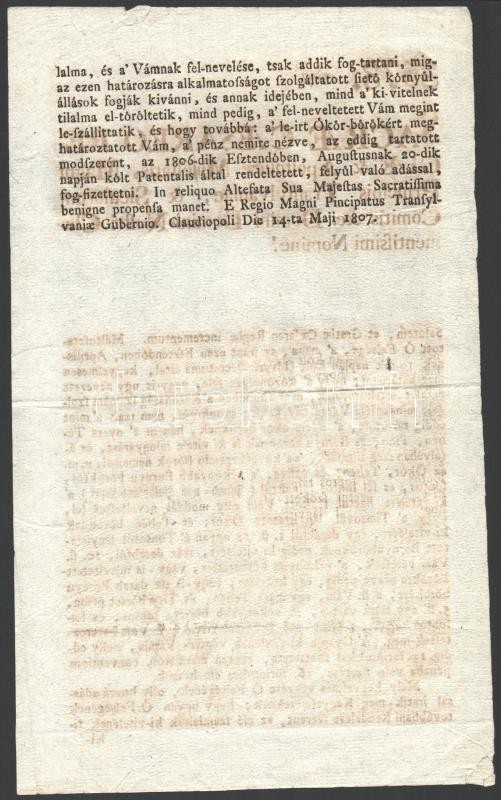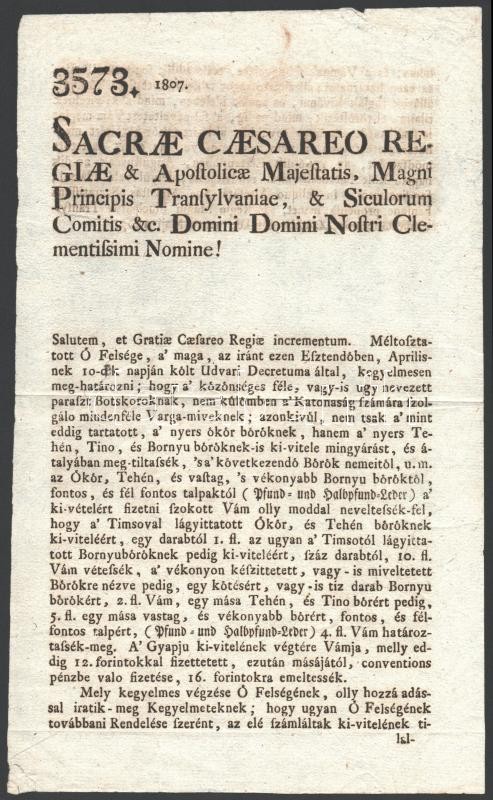 1807 Kolozsvár, uralkodói rendeletről szóló hirdetmény a bőrökre kivetett vám mértékéről, magyar nyelven, 2 p.
