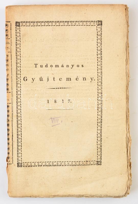 1817-1840 Tudományos Gyűjtemény 14 kötete: 1817. I. évf. VIII., IX.,X. kötete.; 1823. VII. évf. III. kötete.; 1824 VIII. évf. IV. kötete.; 1825 IX. évf. IV., IX.,X., XII. kötetei; 1830 XIV. évf. VIII. kötete.; 1835 XIX. évf. II., III. kötetei.; 1836 XX. évf. VIII. kötete.; 1840 XXIV. évf. IX. kötete.; Szerk.: Fejér György, Thaisz András, Vörösmarty Mihály, Horváth István, Károlyi István. Pest,1817-1840, Trattner János Tamás-Trattner Mátyás-Trattner-Károlyi,164+152+128+128+128+128+132+128+160+129+132 p.+ 1t. +128 p.+1 t.+136+128 p. Kiadói papírkötésben, példányonként változó állapotban, közte a borítókon kisebb szakadásokkal, bebélyegzésekkel és címkékkel, 1817/VIII. kötet foltos, 1823/III. kötet borítója hiányos, 1824/IV. kötet gerince javított, 1825/XII. kötet borítója hiányos, szakadozott és a fűzése laza, 1830/VIII. kötet foltos, a borító és a gerinc szakadozott, és a gerinc elvált a borítótól, 1825/X. kötetből a tábla hiányzik, 1836/VIII. kötetből a tábla hiányzik,
