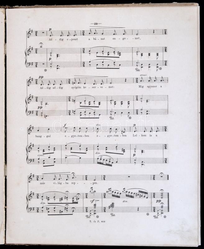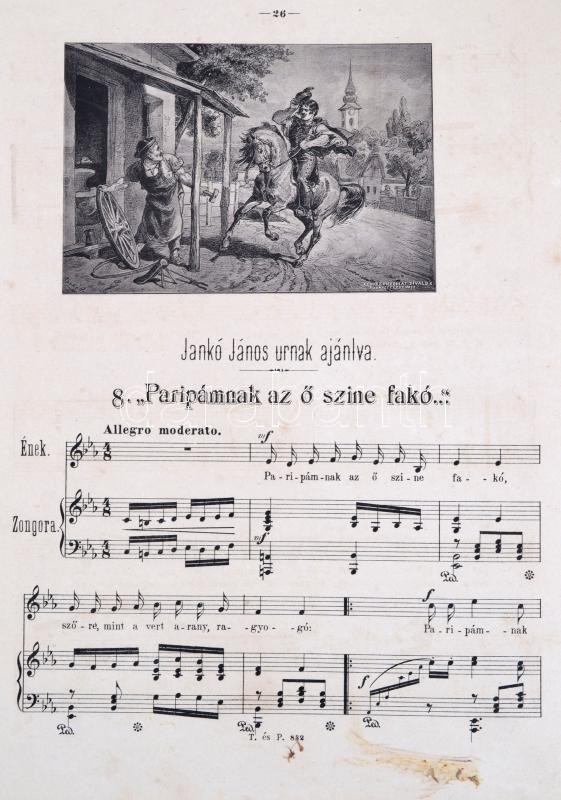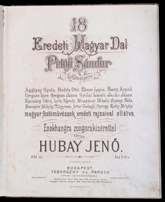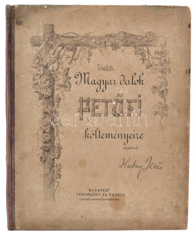 1880 Hubay Jenő: 18 eredeti magyar dal Petőfi Sándor költeményeire. Énekhangra zongorakísérettel szerzé: - -. Feszty Árpád, Lotz Károly, Munkácsy Mihály, Zichy Mihály és más magyar festőművészek eredeti rajzaival ellátva. Bp.,[1880],Táborszky és Parsch, 1 t.+67 p. Első kiadás. Kiadói illusztrált félvászon-kötés, kopott borítóval, laza fűzéssel.
