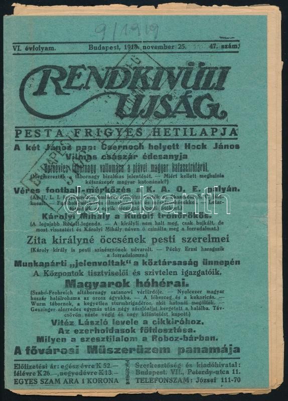 1918 Bp., A Rendkívüli Újság (Pesta Frigyes Hetilapja) VI. évfolyamána... https://www.darabanth.com/en/32-Major-auction/32.1/Art-and-other-collectibles/Printed-Materials~13371/1918-Bp-A-Rendkivuli-Ujsag-Pesta-Frigyes-Hetilapja-VI-evfolyamanak-47-szama-cimlapon-~II2019465