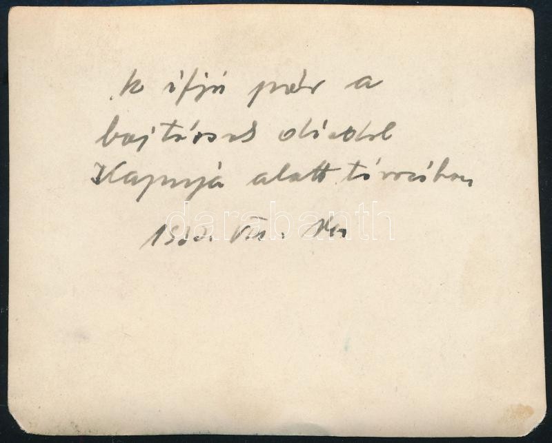 Description: 1933 Ifjú pár házasságkötés utáni fogadtatása az 1933-as cserkész jamboree-n, hátoldalon feliratozott fotó, sarkain kis hiánnyal, 8×10 cm / 1933 Gödöllő, jamboree, after marriage, photo