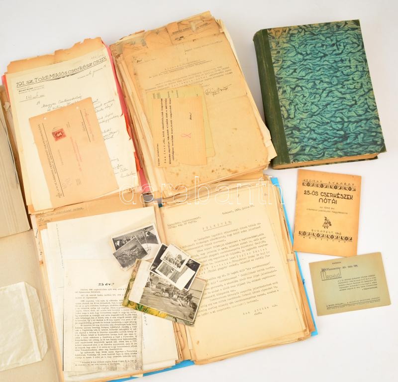 Description: cca 1920-1947 Nagy cserkész gyűjtemény: jamboree és egyéb cserkész fotók, a Magyar Cserkész néhány évfolyama bekötve, cserkészcsapatokkal kapcsolatos (pl. a 18-as sz.) papíranyagok, iratok, összesen több száz darab. / Large boy-scout lot with photos, magazines and scout documents.
