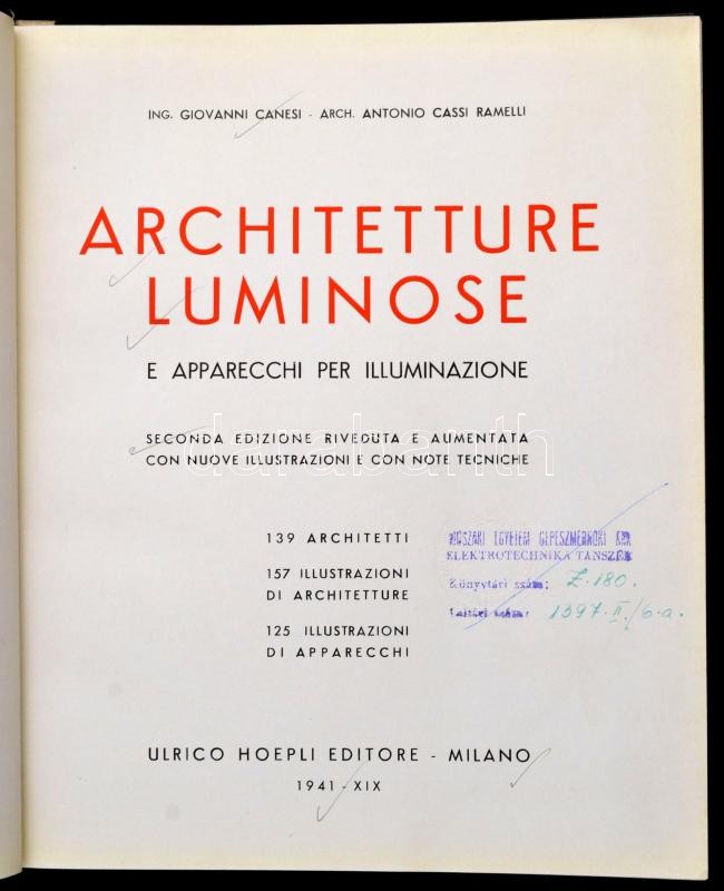 Description: G .di Canesi - Cassi Ramelli: Architetture luminose MIlano, 1941. Ulrico Hoepli. Egészvászon kötésben, sok illusztrációval Volt könyvtári példány. / In full linen binding with many illustrations. Library example