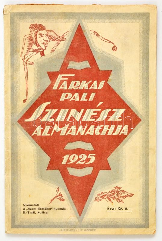 Farkas Pali SzÃnész Almanachja 1925. Kassa, 1925, "Szent Erzsébet"-nyomda, 80 p. Korabeli felvidéki reklámokkal. Kiadói papÃrkötés, kissé szakadással a gerincen. Ritka! Farkas Pál (1875-1955) szÃnész, kabarettista, újságÃró, szerkesztÅ‘, a szlovenszkói magyar szÃntársulat tagja.