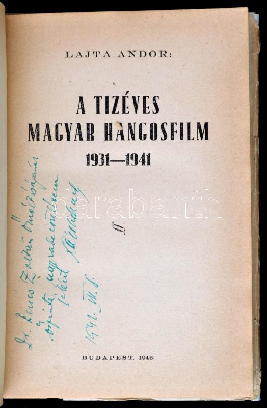 Lajta Andor: A tízéves magyar hangosfilm 1931-1941. Bp.,1942, Otthon-Nyomda. Kiadói egészvászon-kötés, kiadói javított papír védőborítóban, belül jó állapotban. A szerző, Lajta Andor (1891-1962) újságíró, filmtörténész által Dr. Bencs Zoltán (1889-1961) kultuszminisztérium kultúrpolitikai osztálynak filmügyekért felelős egyetemes referense,miniszteri tanácsos, országgyűlési képviselő, a Hunnia Filmgyár alelnöke és művészeti igazgatója részére dedikált.