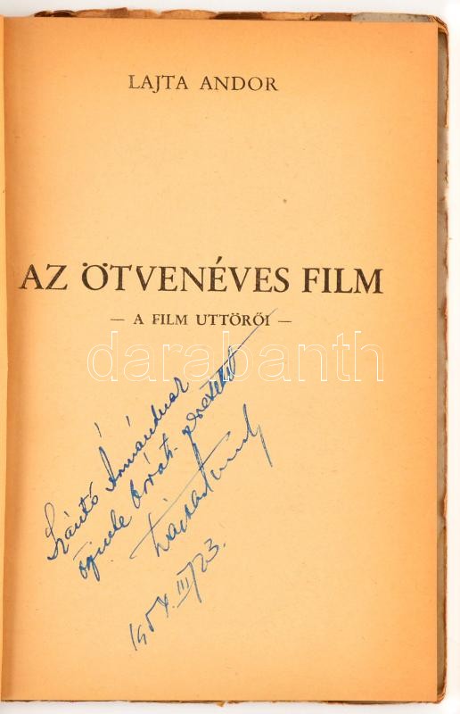 Description: Lajta Andor: Az ötvenéves film. A film úttörői. Bp.,1946, Szerzői kiadás,(Horia-Nyomda, Temesvár.) Kiadói papírkötés, a borító szélei gyűröttek és kissé szakadozottak. Első kiadás. A szerző által dedikált!