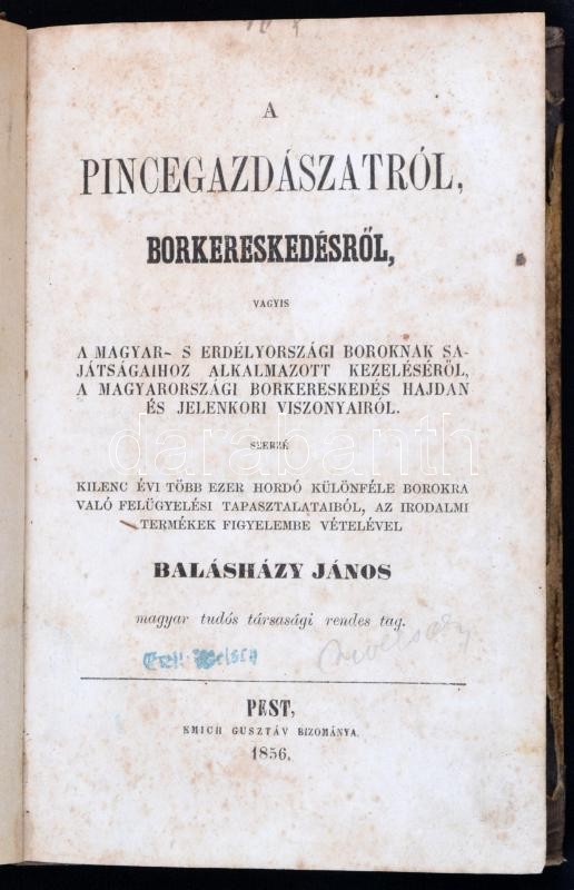 Balásházy János: A pincegazdászatról, borkereskedésről, vagyis a magyar- s erdélyországi boroknak sajátságaihoz alkalmazott kezeléséről, a magyarországi borkereskedés hajdan és jelenkori viszonyairól. Szerzé kilenc évi több ezer hordó különféle borokra való felügyelési tapasztalataiból, az irodalmi termékek figyelembe vételével Balásházy János. Pest, 1856, Emich Gusztáv, XXIII+1+259 p. Egyetlen kiadás. Későbbi átkötött félvászon-kötés, kopott borítóval, foltos, a hátsó kötéstábla papírján és a hátsó szennylapon ceruzás jegyzettel, tulajdonosi névbejegyzéssel, pecséttel. Egyetlen kiadás. Nagyon ritka! Balásházi Balásházy János (1797-1857) ügyvéd, szolgabíró./ János Balásházy:About the cellar factory and wine trade. Pest, 1856, Gustav Emich. In Hungarian language. Half-linen-binding, with worn cover, spotty. Rare!