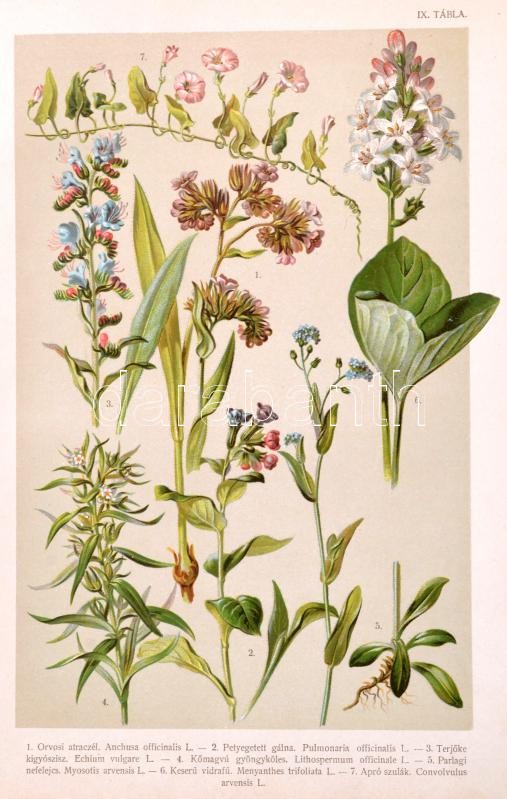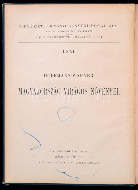 Wagner János: Magyarország virágos növényei. A (Carl) Hoffmann K(ároly) növényatlaszának [Pflanzen-Atlas nach dem Linné'schen System] képeivel. A dr. [Julius] Hoffmann Gy[ula] átdolgozta harmadik kiadás alapján írta: - -. A magyar szöveget átnézte Mágocsy-Dietz Sándor. 67 táblán 375 színes és 582 szövegközti képpel. Természettudományi Könyvkiadó-Vállalat LXXI. kötet. Bp., 1903, K. M. Természettudományi Társulat, (Athenaeum ny.). XXV+1+241 p.+LXVII t. (kromolitográfia). Első kiadás. Kiadói aranyozott gerincű, vaknyomásos, festett, zöld egészvászon kötésben, Athenaeum-kötészet, márványmintás lapélekkel, kissé kopott borítóval, az első 3 lapon és az elülső kötéstáblán ceruzás firkával, 241 oldalon kis lyukkal (de a szöveget nem érinti), egy két lapon kisebb szakadással.