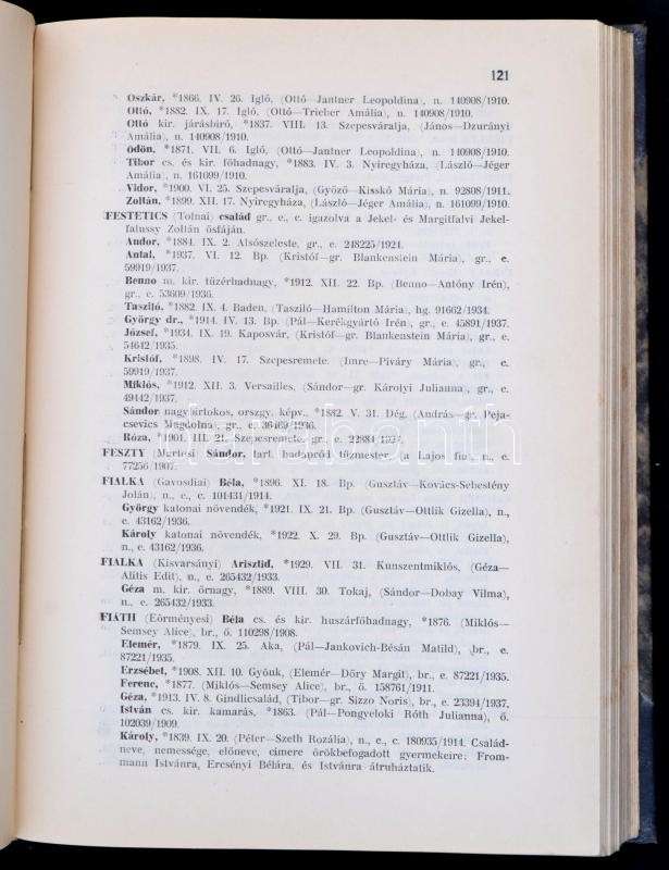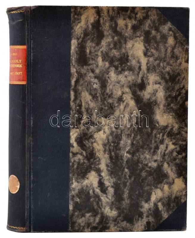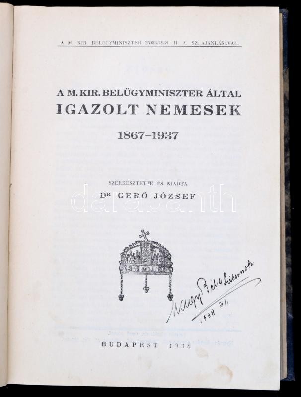 A m. kir. belügyminiszterek által igazolt nemesek. 1867-1937. Szerk.: Dr. Gerő József. Bp.,1938, Kovács és Szegedi-ny., 406 p. Átkötött félvászon-kötésben. Nagybaczoni Nagy Béla (1882-1962) m. kir. tábornok névbejegyzésével, dátumozva (1938. XI.1.)/ The certified nobles by the Hungarian royal home affairs ministers. 1867-1937. Edited by József Gerő. Bp.,1938, Kovács and Szegedi Press, 406 p. Half-linen-binding. In Hungarian language. With name notice of Béla Nagy of Nagybaczon (1882-1962) Hungarian royal general, with date (1938.XI.1.)