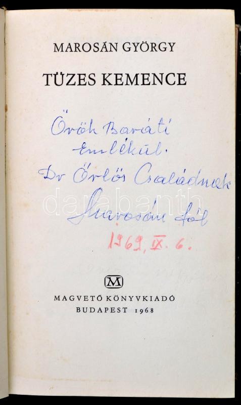 Marosán György: Tüzes kemence. Bp., 1968, Magvető, 792+4 p. Első kiadás. Kiadói egészvászon-kötés, kiadói szakadozott papír védőborítóban. A szerző, id. Marosán György (1908-1992) politikus, író által a címlapon dedikált, a borító alján aláírt példány.+Egy ex libris a hátoldalán Marosán György ajándékozási soraival.+Valamint egy saját kézzel írt magán levele, másfél beírt oldal, kis szakadással, 1 sztl. lev./ Paperbinding, in Hungarian language. With signed by the author.