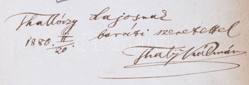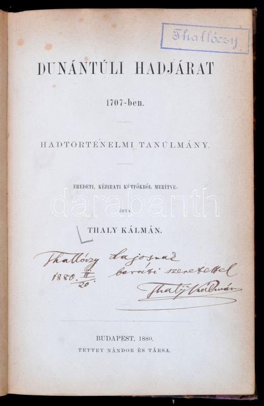Thaly Kálmán: Dunántúli hadjárat 1707-ben. Hadtörténelmi tanulmány. Bp., 1880, Tettey Nándor és Társa, (Athenaeum-ny.), VIII+228 p. Későbbi átkötött aranyozott gerincű félvászon-kötés, kopott borítóval, a gerincen kis sérüléssel, intézményi bélyegzőkkel és címkével. A szerző, tali és szécsiszigeti Thaly Kálmán (1839-1909) író, költő, történész, MTA tag, országgyűlési képviselő által Thallóczy Lajos (1857-1916) történész, MTA tag, Magyar Történelmi Társulat (1913-1916), politikus részére dedikált példány, dátumozva./ Half-linen-binding, with worn cover, and little bit damaged spine. Singed by the author.