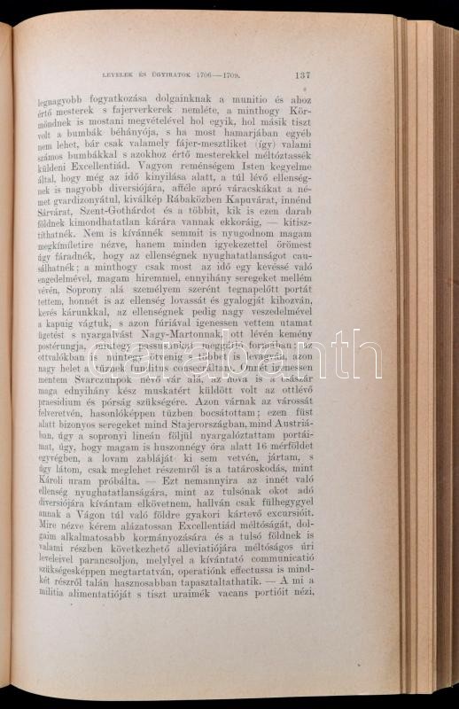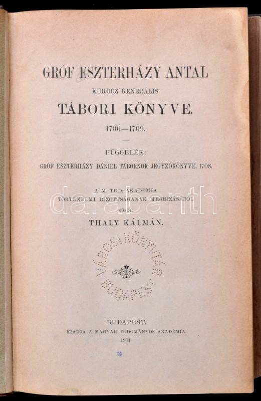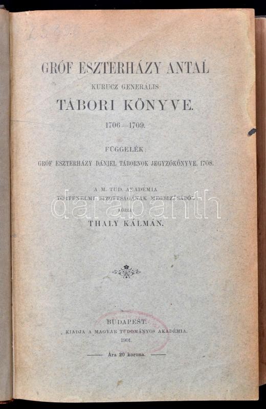 Thaly Kálmán: Gróf Eszterházy Antal kuruc generális tábori könyve. 1706-1709. Függelék: Gróf Eszterházy Dániel tábornok jegyzőkönyve, 1708. Bp.,1901, MTA, XVIII+2+2032 p. Későbbi átkötött aranyozott gerincű félbőr-kötésben, az elülső papírborítót bekötötték, a borítója kissé kopottas, a gerincen kis sérüléssel, intézményi bélyegzéssel, címkével, de egyébként jó állapotban./ Half-leather-binding, with little bit worn cover, and little damage on the spine, but the other things are okay. In Hungarian language.