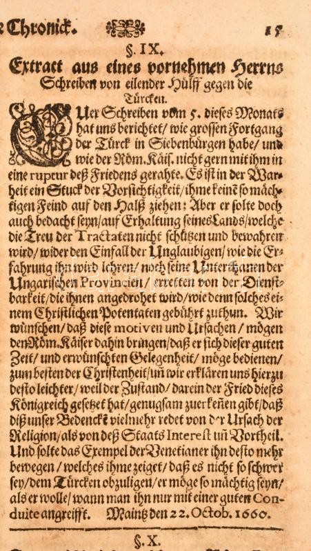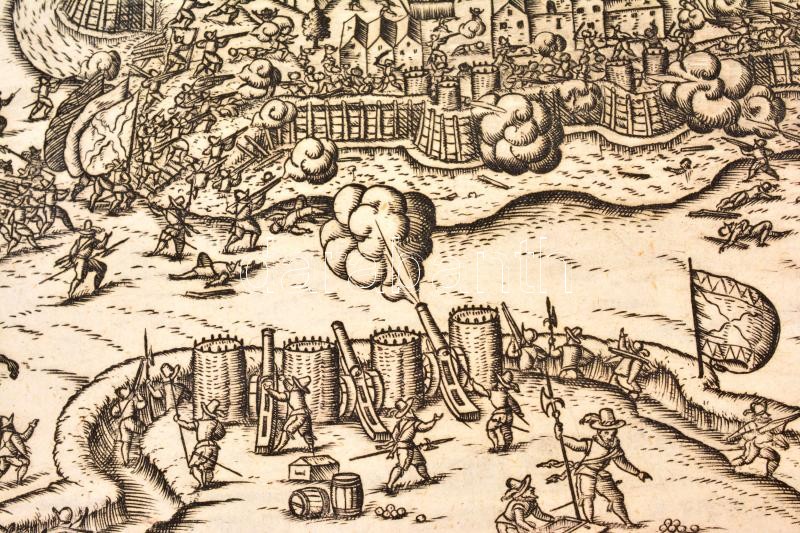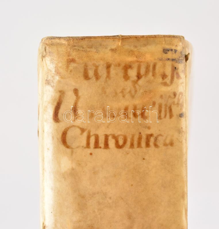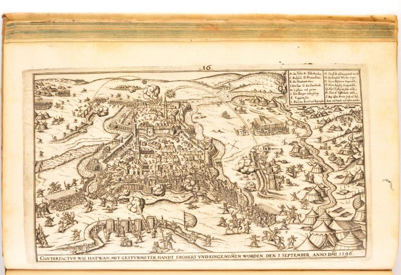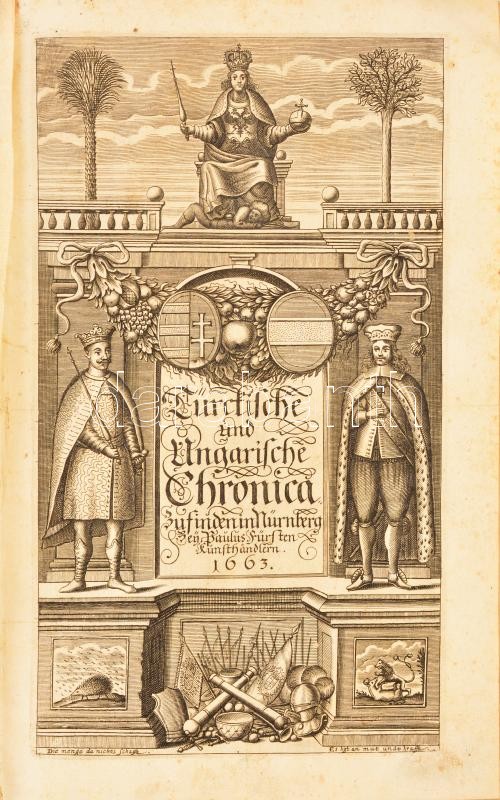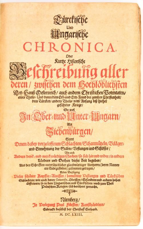 Türckische Und Ungarische Chronica Oder Kurtze Historische Beschreibung aller deren, zwischen dem Hochlöblichsten Ertz-Hausz Oesterreich, auch anderen Christlichen Potentaten eines Theils; Und... dem Türcken, anders Theils vom Anfang bis hierher geführter Kriege sowohl in Ober-und Unter-Ungarn Als Siebenbürgen... aus den Schriften unterschiedlicher glaubwürdiger Authoren... Neben Beyfügung Vieler schöner Kuppfer-Abrissen. Nürnberg, 1663. In Verlegung Paul Fürsten... Gedruckt bey Christoff Gerhard. 1t. (rézmetszetű díszcímlap)+(6)+314+(6)p.+63t.+1 kihajtható melléklet. Német nyelven. A különböző forrásokból (Bonfini, Ortelius, Zsámboki János) összeállított munka nagyrészt a török-magyar harcok történetét írja le. Emellett jelentős teret szentel a török birodalom bemutatásának. Az első harminc rézmetszeten -- a tizenötéves háborúhoz kapcsolódva -- a jelentősebb várostromok és események képei láthatók, Johann Sibmacher munkái nyomán. A következő tizenöt képen a kor jelentős személyiségeinek ovális mellképei találhatók -- köztük Miksa főherceg, Zrínyi Miklós és III. Mehmed szultán ábrázolása --, amelyek Domenicus Custos munkái alapján születtek. A 46. táblán három lovas alakja, majd három kétosztatú lapon hat magyar vár látképe következik. Ezután 13 kilencosztatú rézmetszeten osztrák és magyar főurak mellképei kaptak helyet, melyek Elias Wiedemann nyomán készültek. A művet Újzrínyivár környékének térképe Zrínyi Miklós képével és IV. Mehmed szultán ábrázolása zárja. Korabeli pergamenkötésben. Egy táblán képet nem érintő beszakadások, egyébként nagyon szép állapotú példány!/ Türckische Und Ungarische Chronica Oder Kurtze Historische Beschreibung aller deren, zwischen dem Hochlöblichsten Ertz-Hausz Oesterreich, auch anderen Christlichen Potentaten eines Theils; Und... dem Türcken, anders Theils vom Anfang bis hierher geführter Kriege sowohl in Ober-und Unter-Ungarn Als Siebenbürgen... aus den Schriften unterschiedlicher glaubwürdiger Authoren... Neben Beyfügung Vieler schöner Kuppfer-Abrissen. Nürnberg, 1663., In Verlegung Paul Fürsten... Gedruckt bey Christoff Gerhard. 1t. (Copper-engraving decorative titlepage)+(6)+314+(6) p + 63 t.+ 1 openable appendix. In German language. This work mainly tells the history of the Turkish-Hungarian Wars and fights from selected source, and shows the Turkish Empire. With many copper engraving illustrations about the important Castles sieges - Long Turkish War/Fifteen Years War - after Johann Sibmacher works. With the bust in oval frame of significant personalities, Maximilian of Austria archduke, Miklós Zrinyi, Mehmed II. and others after Domenicus Custos works. With three horseman on the 46th table, next six Hungarian castles on three two-side pages. Next with bust of Austrian and Hungarian nobles on thirteen pieces of nine divided pages after Elias Wiedemann works. Next the map of Novi Zrin. And in the end with the portrait of Mehmed IV. and Miklós Zrinyi. In Parchment-binding, with little damage on one table but the illustration is okay. In good condition.