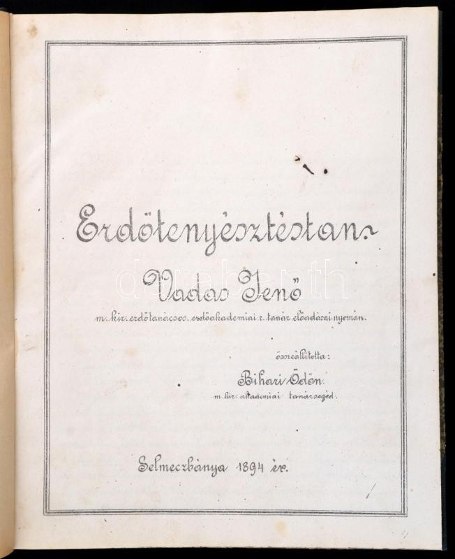 1894 Vadas Jenő: Erdőtenyésztéstan. Vadas Jenő m. kir. erdőtanácsos, erdőakadémiai r. tanár előadásai nyomán. Összeállította: Bihar Ödön m. kir. akadémiai tanársegéd. Selmecbánya, 1894, ny.n., 224 p. Szövegközti rajzokkal. Korabeli félvászon-kötés, kissé kopott, kissé foltos borítóval. Stencilezéssel sokszorosított selmecbányai erdészeti jegyzet. Vadas Jenő (1857-1922) erdőmérnök, erdészeti szakíró, a magyarországi erdők főtanácsosa, a selmecbányai Bányászati és Erdészeti Akadémia tanára.