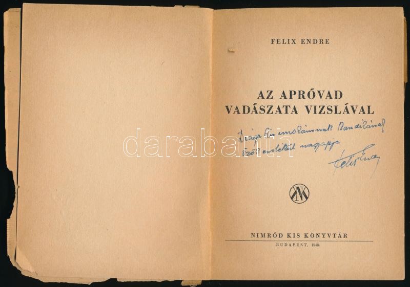 Felix Endre: Az apróvad vadászata vizslával. Dedikált, a szerző unokáj... https://www.darabanth.com/en/32-Major-auction/32.1/Books/Books-Hunting~13382/Felix-Endre-Az-aprovad-vadaszata-vizslaval-Dedikalt-a-szerzo-unokajanak-Bp-1948-Nimro~II2029309