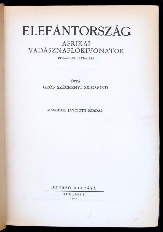 Széchenyi Zsigmond: Elefántország. Afrikai vadásznapló-kivonatok. 1932-1933, 1933-1934. Bp., 1944, Szerzői kiadás, (Athenaeum-ny.), 216+2 p.+35 t.(Kétoldalas fekete-fehér fotók.)+1 térkép. Második, javított kiadás. Későbbi, Afrikát ábrázoló, átkötött egészvászon-kötésben, pótolt térképpel. A szerző, Széchényi Zsigmond (1898-1967) író, utazó, vadász által aláírt, dátumozott (1950) példány.