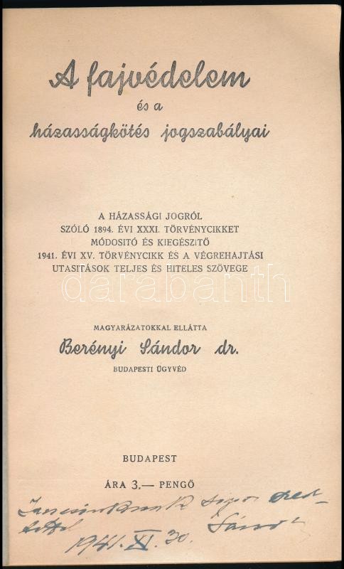 A fajvédelem és a házasságkötés jogszabályai. Szerk.: Berényi Sándor. ... https://www.darabanth.com/en/32-Major-auction/32.1/Books/Books-Law~13377/A-fajvedelem-es-a-hazassagkotes-jogszabalyai-Szerk-Berenyi-Sandor-Bp-1941-Szerzoi~II2036435